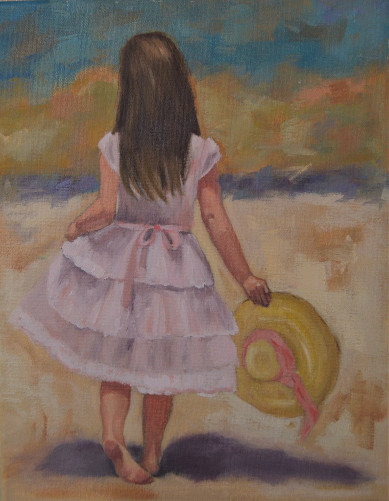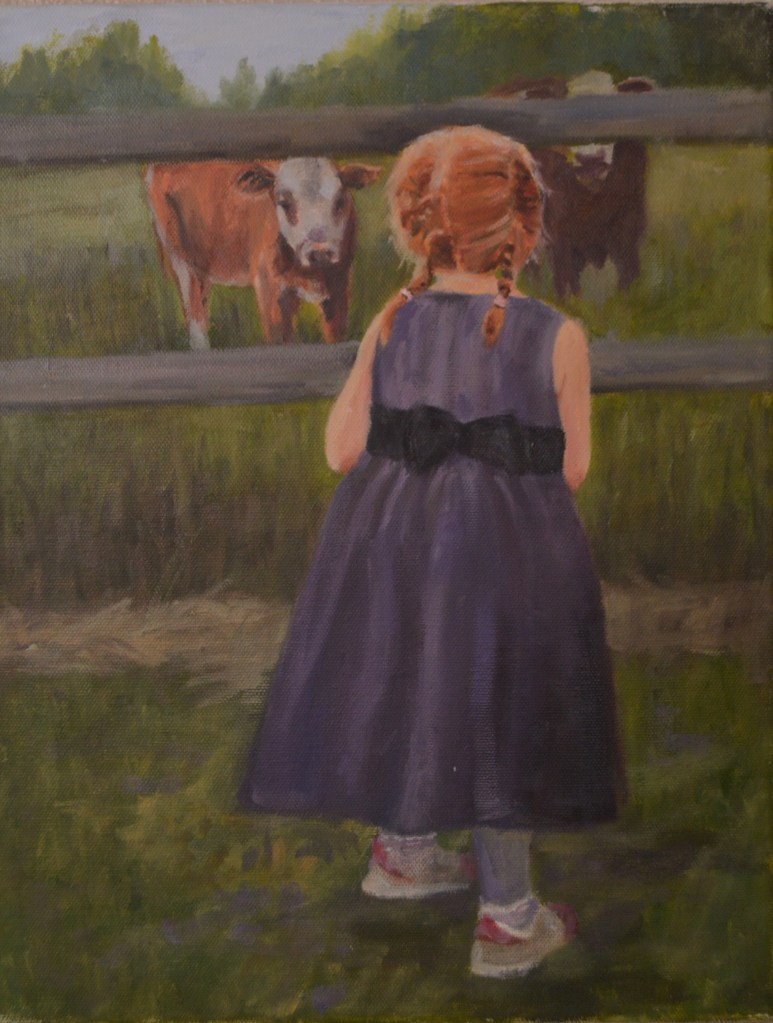 “Purple Velvet Dress” This painting is symbolic of me as a young girl in tennis shoes and purpule velvet dress on my Grandpa Christensen’s farm.